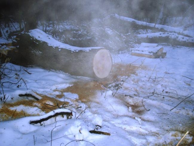 Работники которые осуществляли погрузку бревен в машины, сообщили что представляют фирму МЖК-Сервис и делают расчистку участка под строительство. Они отказались показать какие-либо документы.