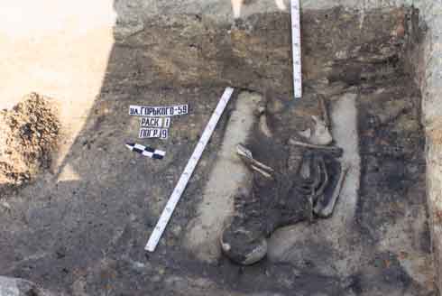 Раскопки по ул. Горького, 34 захоронение изрубленых воинов 10-11 столетие.