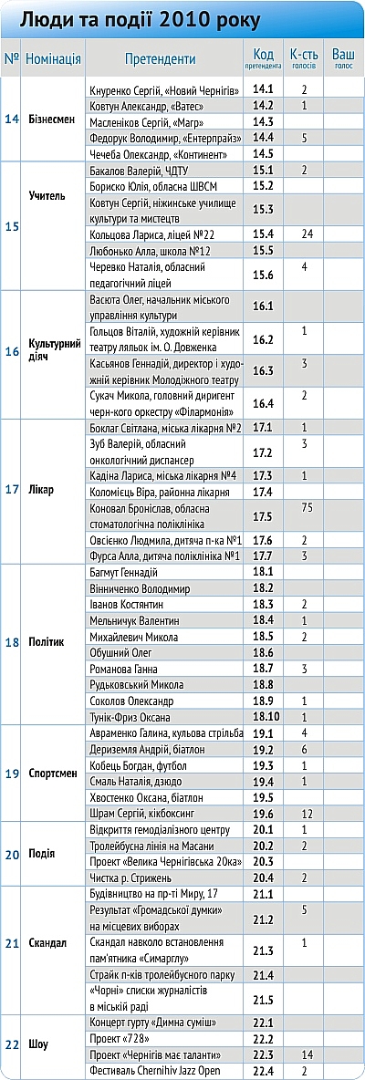 1) заповнити анкету, поставивши відмітку в клітинці «Ваш голос» за найкращого, на вашу думку, номінанта. Відправити або занести анкету до редакції газети «Семь дней» за адресою: вул. Щорса, 12, оф. 76 з приміткою «Наше місто». Анкети приймаються до 25 лютого 2011 р.;