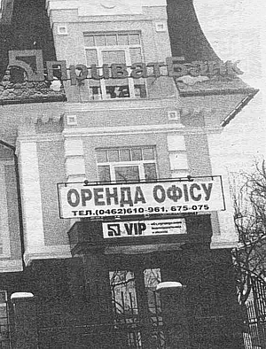 Неделю назад, проезжая по улице Воинов-интернационалистов, на здании с вывеской «ПриватБанк», что у Стрижня, увидела табличку: «Оренда офісу». Тут же указаны номера телефонов. В этом помещении находилось отделение «ПриватБанка» для вип-клиентов (особо важных).
