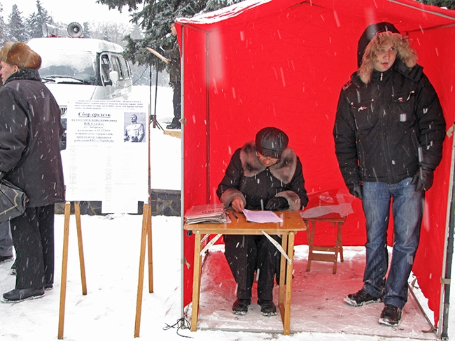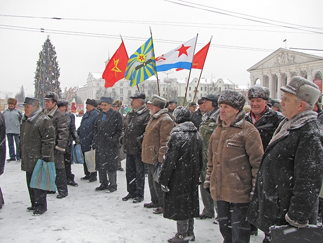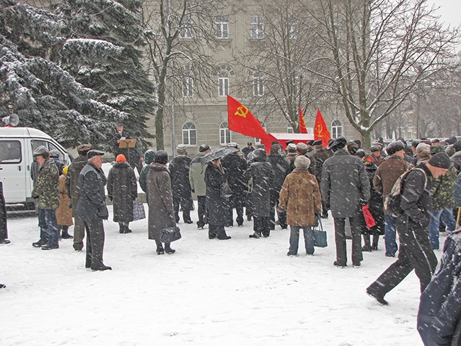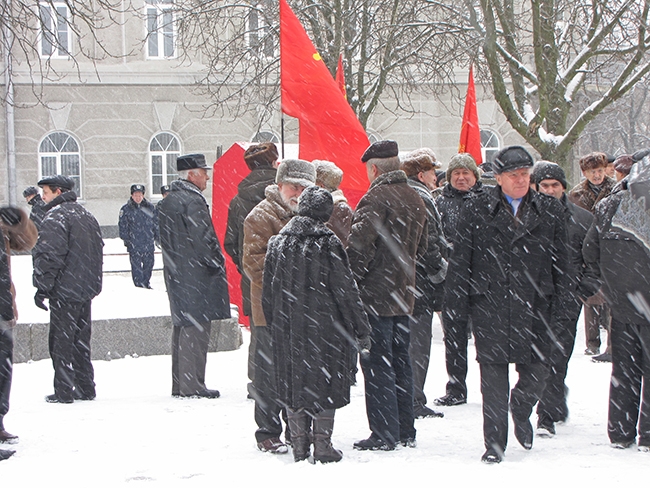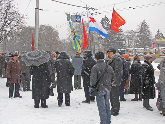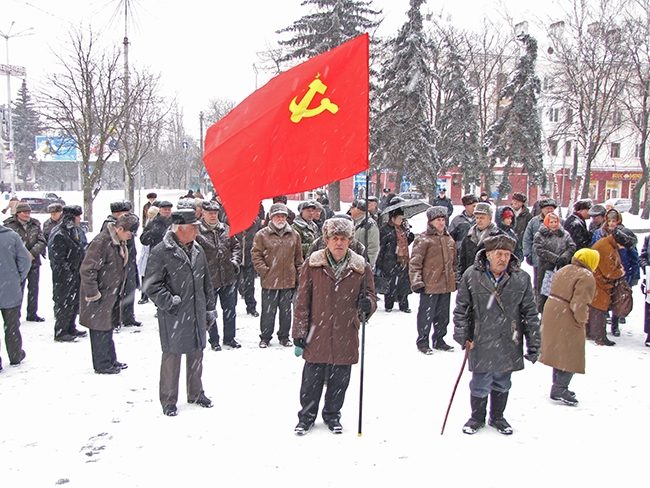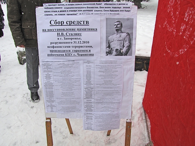У входа на Алею Героев расставлены плакаты, осуждающие бездеятельность власти в борьбе с неофашизмом. Здесь же в палатке производится сбор средств на восстановление памятника И. В. Сталину в г. Запорожье, разрушенного 31 декабря неофашистами-террористами. Митингующие, в основном люди старшего поколения, они держат в руках флаги с Советской символикой.
