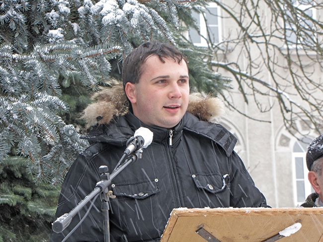 Открыл митинг Михаил Петрущенков (Коммунистическая партия Украины). В своем выступлении он осудил бездеятельность исполнительной власти и правоохранительных органов Украины в отношении последователей верных слуг немецких фашистов, предателей и палачей украинского народа.