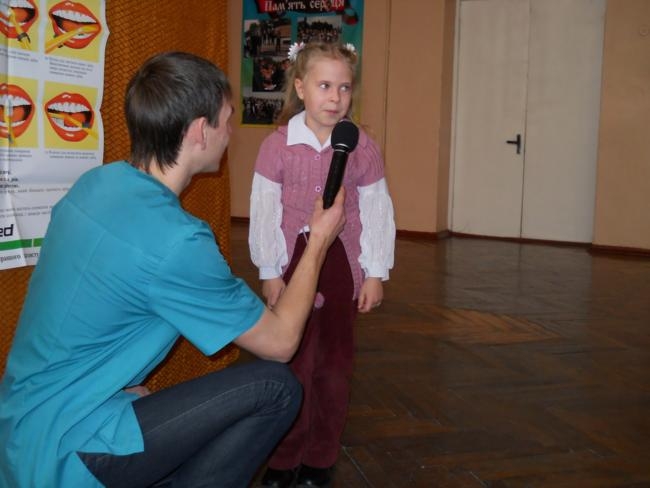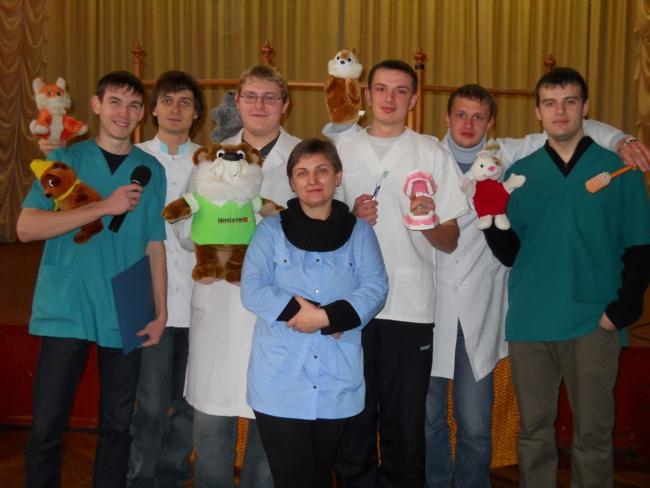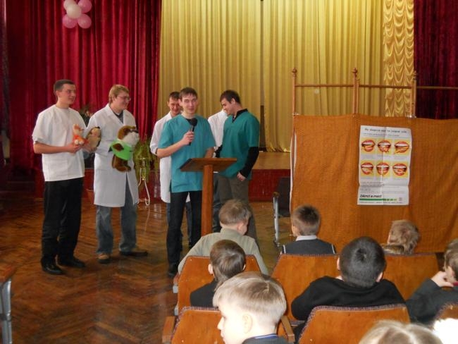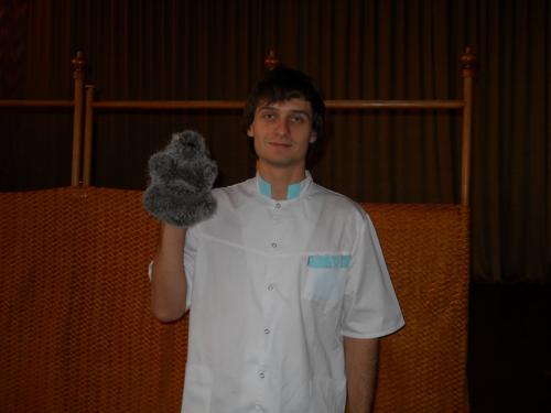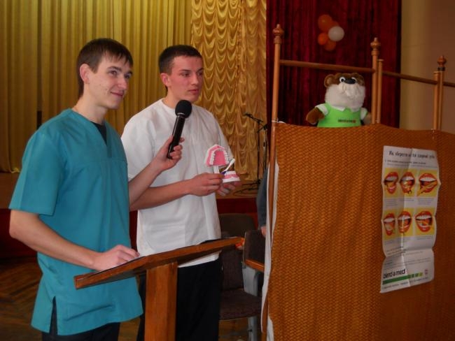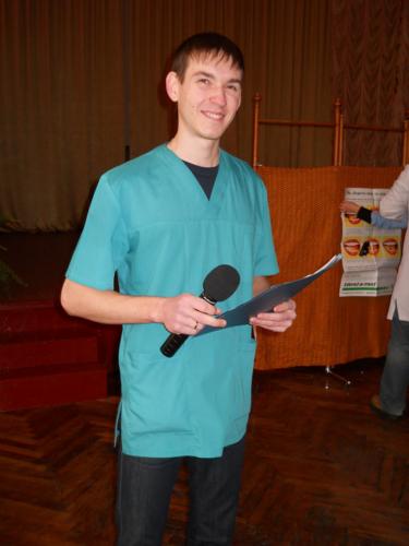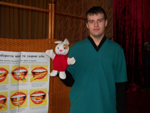 Тарас Мысик, врач-интерн. Украинская медицинская стоматологическая академия (Полтава): я, как раз, практикуюсь в этом лицее. Уже знаю многих детей. После спектакля ведем всех на осмотр.