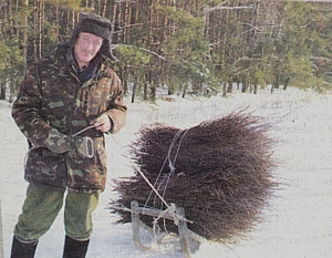 Дорогою зустрічаємо чоловіка із дерев'яними санчатами. Везе березові гілки.