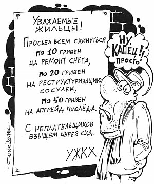 И еще одно. Сегодня практически каждую неделю мы слышим о росте тарифов на коммунальные услуги. К сожалению, качество услуг не всегда адекватно ценам. В том, что жильцы недополучают тех или иных услуг, на наш взгляд, виновато не правительство, которое многие винят во всех грехах. Это недоработки (или бездеятельность) местного самоуправления, которые нужно срочно исправлять. И если жители города не заставят работников ЖЭКа убирать в подъезде, расчищать снег во дворе, никто этого за них не сделает. В то же время мы надеемся, что депутаты городского совета, которых избрали жители нашего города, не останутся в стороне от проблемы, и окажут содействие в наведении порядка в коммунальном секторе города. Думаем, что в стороне от решения проблемы не останутся и депутаты Верховной Рады, которым небезразлично будущее нашего города.