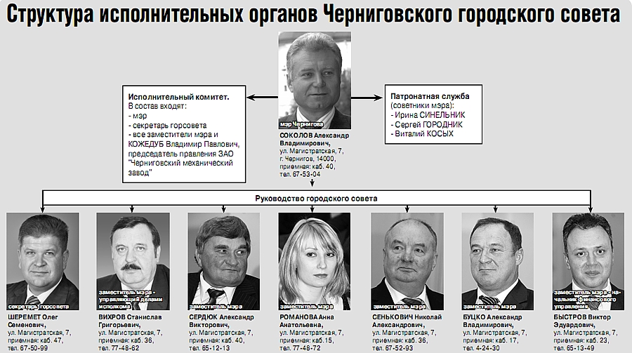 Кроме того, в новой структуре горсовета появилось такое подразделение, как «Руководство» и «Патронатная служба». Что это? По информации, которую нам предоставил отдел кадровой работы, «Руководство» – это мэр, шесть его замов и секретарь горсовета. А «Патронатная служба» – это советники мэра. Причем нужно отметить, что теперь их у него три – кроме Ирины Синельник и Сергея Городника, советником Александра Соколова с 9 декабря 2010 года работает экс-мэр Чернигова Виталий Косых.