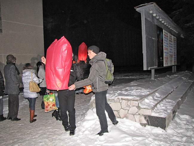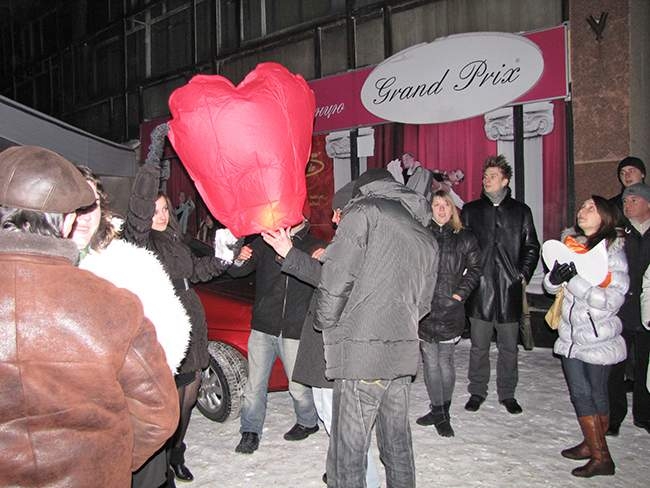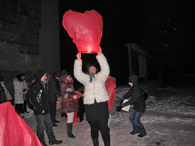 По окончании шоу-программы, влюбленные пары прямо возле Дворца культуры запустили небесные фонарики, которые долго светились в ночном зимнем небе.