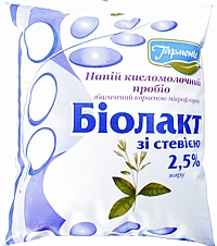 Наступний оригінальний кисломолочний продукт – «Біолакт». Вирізняється він тим, що має легкий солодкий присмак, але це не цукор, а солодка рослинна стевія, що солодша за цукор в 60 разів. Ми її додаємо не тільки для покращення смаку, а ще й для надання додаткових переваг, адже стевія визнана в Японії рослиною ХХІ сторіччя, наскільки позитивно вона впливає на організм. Хто зацікавиться, може знайти додаткові відомості у статтях відомого лікаря-пропагандиста цієї рослини Валентини Порфирівни Чорної.