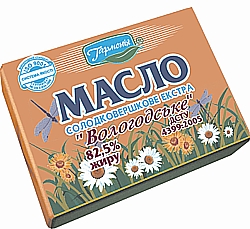 Ми пропонуємо вам спробувати масло нашої ТМ «Гармонія». Його асортимент: «Вологодське» (82,5%), «Селянське» (73%), «Шоколадне» (62%). Це висококалорійні продукти, до складу яких входить молочний жир, вітаміни А, В, С, Е.