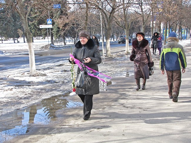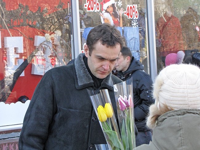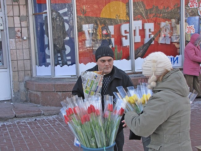 Возле подземных переходов торгуют тюльпанами частники, которые в своем подсобном хозяйстве специально к этому празднику выращивают цветы. Тюльпаны у них 12-20 грн. букетик из трех цветков.