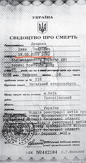 Пенсіонерка Ганна Дяченко показує свідоцтво про смерть свого чоловіка, де вказано, що Дяченко Іван Павлович помер 18.03.2003 року, про що у книзі реєстрації актів про смерть 19.03.2003 р. зроблено запис за №216. Тут же пані Ганна демонструє договір оренди між Дяченком Іваном Павловичем та ЗАТ «Ніжинська сільгосптехніка» в особі директора Барила Анатолія Петровича. Зверніть увагу, договір цей зареєстровано в Ніжинському районному відділі Чернігівської регіональної філії центру ДЗК 28 березня 2005 року. Далі ще цікавіше – документ, виявляється, складено взагалі 8 квітня того ж таки 2005 року.
