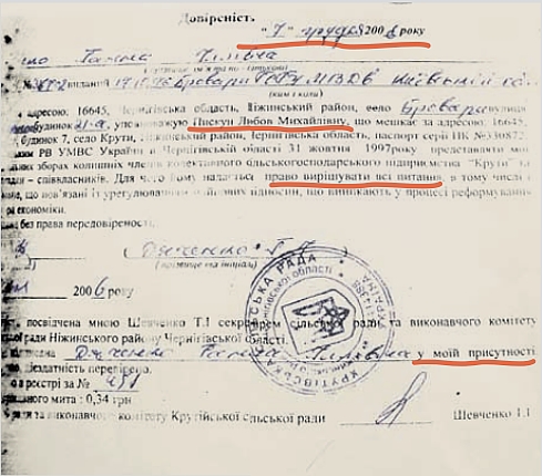 «Що ж виходить, – дивується Ганна Дяченко, – чоловік помер, потім через два роки воскрес і уклав договір оренди своєї земельної ділянки. Це ще не все, – розповідає старенька, – знайшовся й договір, складений від мого імені, але який я в очі не бачила і підпису свого на ньому не ставила. Щоб знайти цей документ, мені довелося п’ять разів їздити в ДЗК. Коли мені показали папку з моїми паперами під №195, я ледь не впала – там було 195 договорів, 195 довіреностей та 195 додаткових угод (цифри, скоріше за все, умовні. – Авт.). Із усього цього у мене лише один примірник на руках». Не розуміє Ганна Дяченко і звідки могла узятися довіреність, якою вона 7 грудня 2006 року надала Пискун Любові Михайлівні право вирішувати всі свої питання, в тому числі й щодо урегулювання майнових відносин. «Нічого подібного я не підписувала», – запевняє пенсіонерка.
