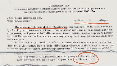 Як з’ясувалося, Любов Пискун, на підставі довіреностей, якими пайовики, так би мовити, уповноважили її вести їхні справи, 2 серпня 2010 року уклала додаткові угоди до договорів оренди земельних ділянок. У цих документах зазначено, що ЗАТ «Ніжинська сільгосптехніка» реорганізоване у ТОВ «Ніжинська сільгосптехніка». Ось, виявляється, звідки взялося це загадкове товариство, про яке згадувалося вище. Тобто виходить, що власники земельних паїв у Крутах, які начебто укладали договори із закритим акціонерним товариством «Ніжинська сільгосптехніка», насправді перебувають у договірних відносинах з підприємством іншої форми власності. Не секрет, що ТОВ «Ніжинська сільгосптехніка» якимось чином належить СТОВ «Дружба-Нова». Василь Малик, заступник генерального директора «Дружби-Нової», до речі, це підтвердив.