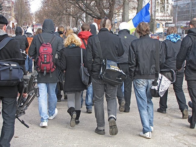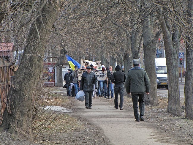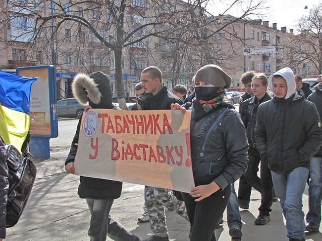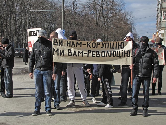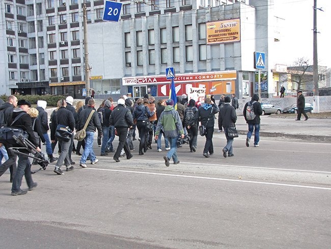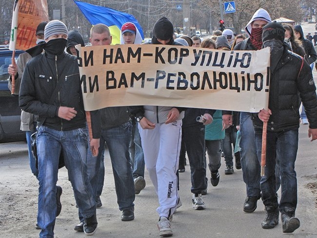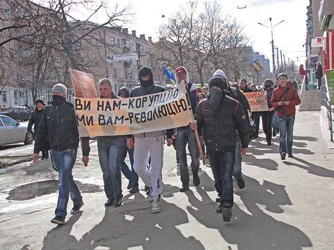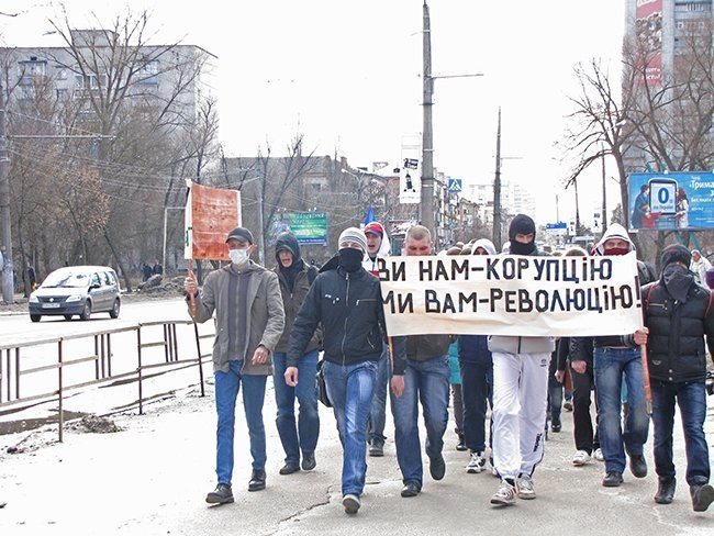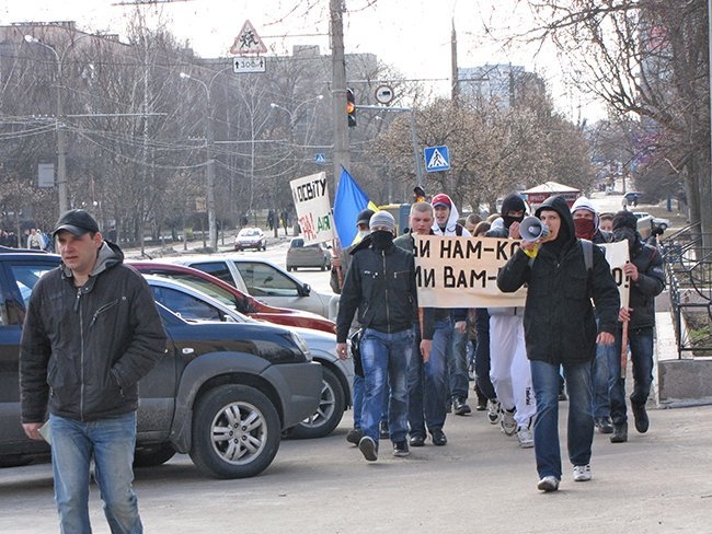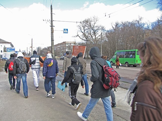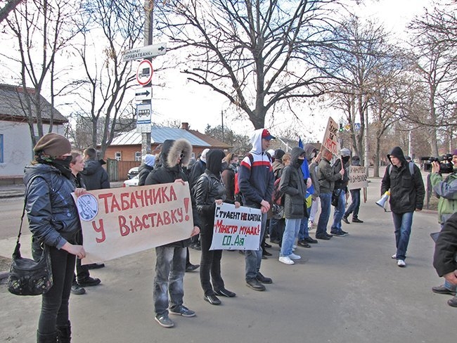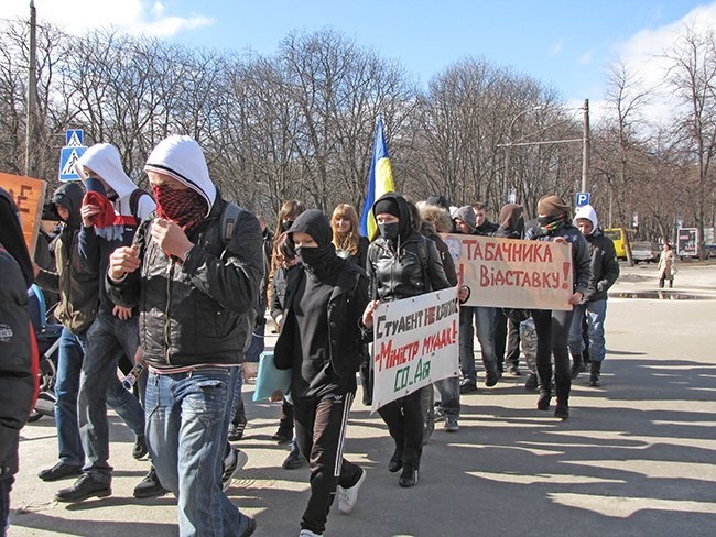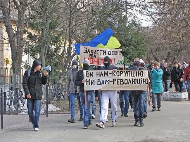 Несколько десятков молодых людей прошли улицами города, скандируя: «Ви нам – корупцію, ми вам – революцію!», «Захистіть освіту від монстра!», «Міністр мудак – студент не кріпак!».