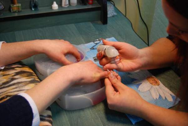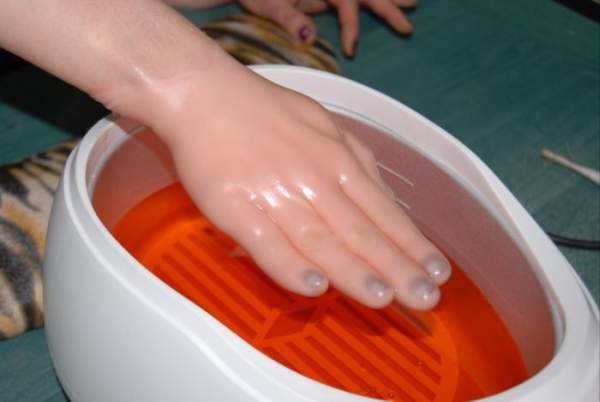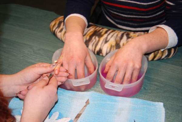 Замачивание производится в специальном растворе, который должен размягчить кутикулу, оказать успокаивающее и расслабляющее воздействие на кожу рук в целом. Мы используем раствор морской соли.