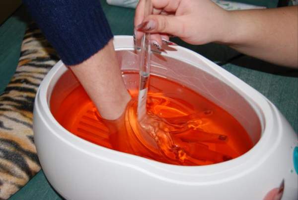 К этому моменту уже готова ванночка с расплавленным парафином, температура его 54 градуса. Ручки необходимо погружать в теплый парафин от 3 до 5 раз. После погружения руки заворачивают в защитные пакеты. Не бойтесь обжечься. Ведь парафин имеет низкую теплопроводность, медленно отдавая тепло Вашим рукам. Сверху одевают махровые варежки специально для парафинотерапии.