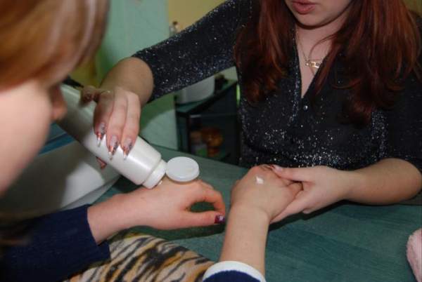 Сначала с помощью скраба очищается кожа рук, отшелушиваются ороговевшие клетки. Потом массажными движениями в кожу рук втирается специальный питательный крем.
