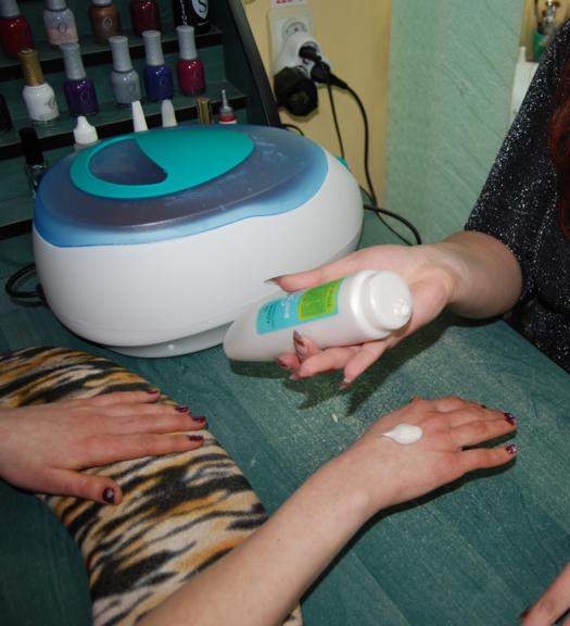 Завершающим этапом становится нанесение на кожу рук защитного крема. Результатом процедуры становится очищенная от шлаков, подпитанная питательным кремом, ухоженная кожа.