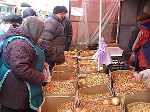 Із сортів, які добре зберігаються взимку, на базарі продається цибуля-сіянка сорту «Халцедон». За півлітрову банку - 8 гривень.