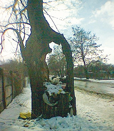 О деревьях: вот такое дуплистое дерево растет на улице Михалевича прямо около проезжей части. Правда, еще неизвестно, на чем держится ствол и где ездит тот автомобиль, на который это дерево рухнет. Но вот мусоросборник в дупле сделали замечательный. Может, коммунальщикам все-таки стоит снести небезопасное растение?