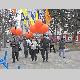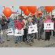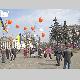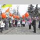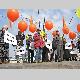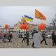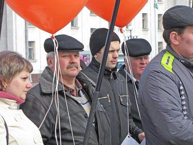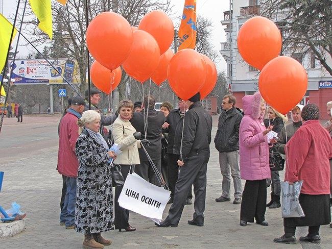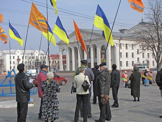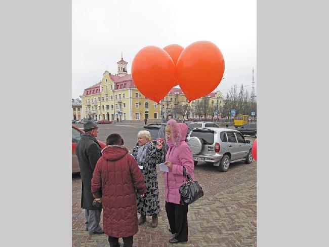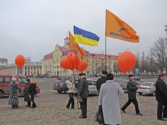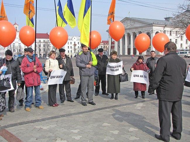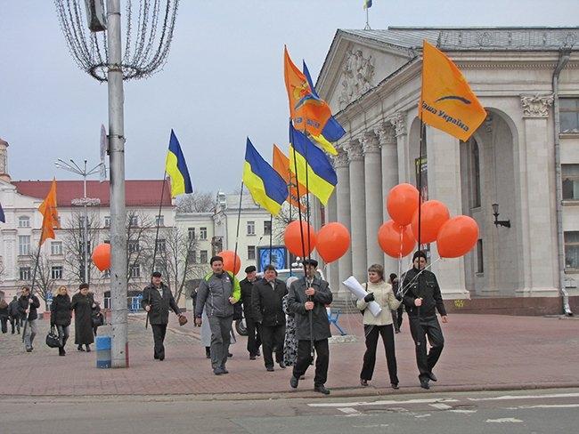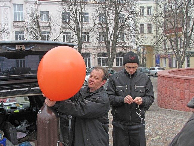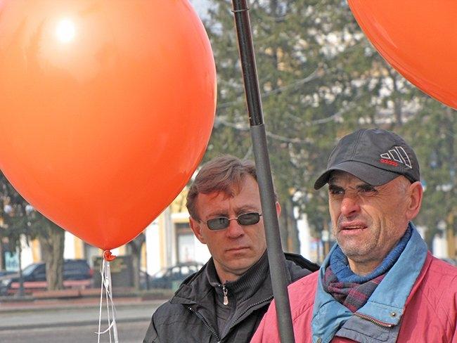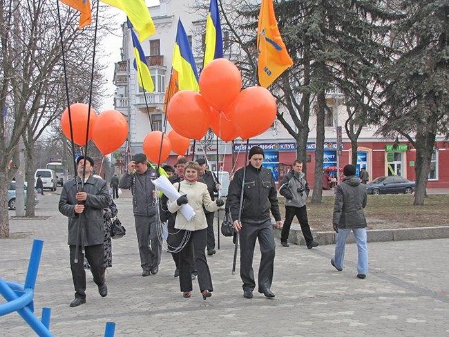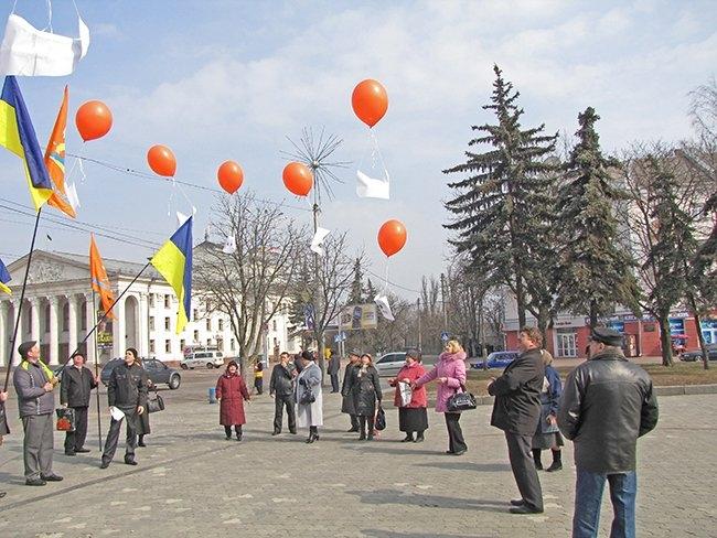 Несколько десятков людей пришли на центральную площадь как на парад. Надув под стенами драмтеатра оранжевые шары, и развернув партийные флаги, они прошествовали под стены облгосадминистрации, где и провели небольшой митинг.