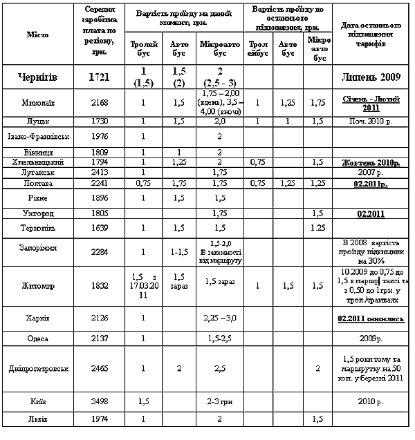 Порівняльна таблиця вартості проїзду на міський транспорт по інших регіонах України: