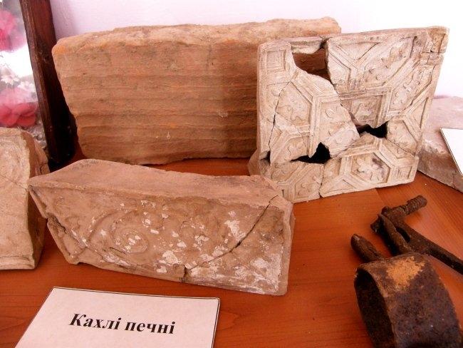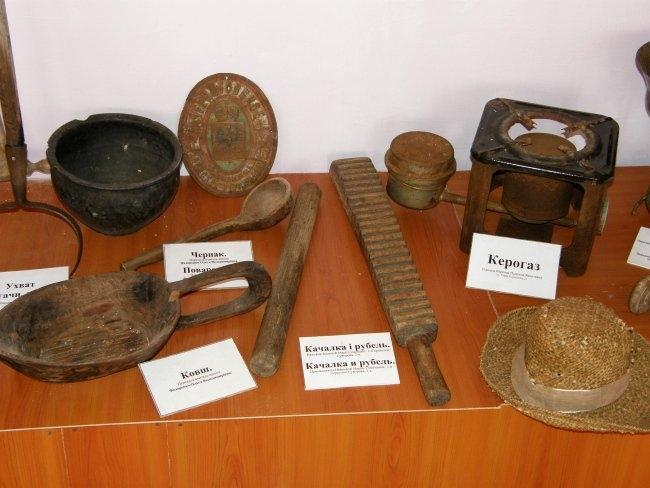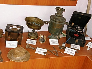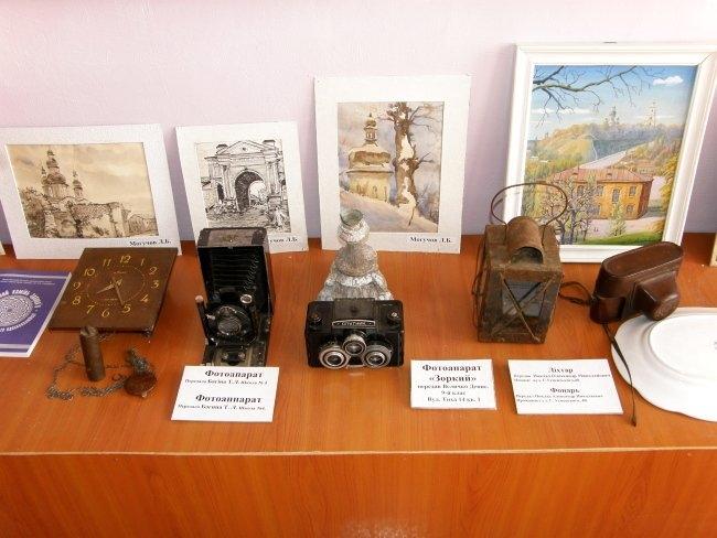 Например, фото древних храмов, пещер, деревянных домиков с резными наличниками, карнизами и фронтонами. Но самые интересные экспонаты находятся на полке под стендами. Это старинные печные изразцы, древнерусский кирпич - плинфа, предметы быта - ухват, черпак, ковш, самовар, примус, угольный утюг, керогаз, "технические новшества" своего времени - радиоприемник, печатная машинка, патефон, различные марки фотоаппаратов, среди которых и "Зоркий", коньки "Пионер", и многое другое.