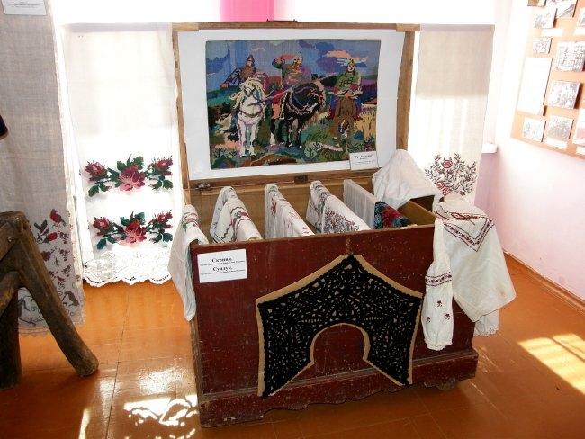 Центральное место в экспозиции занимают настоящий ткацкий станок, прялка и старинный сундук с вышитыми рушниками в нем.