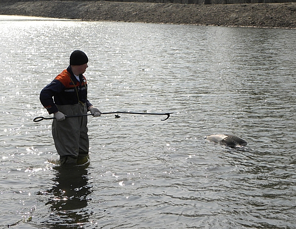 Чтобы достать его из воды, к месту происшествия прибыли сотрудники аварийно-спасательной части. Один из спасателей зашел в воду и с помощью спецсредства вытащил на берег погибшего мужчины.