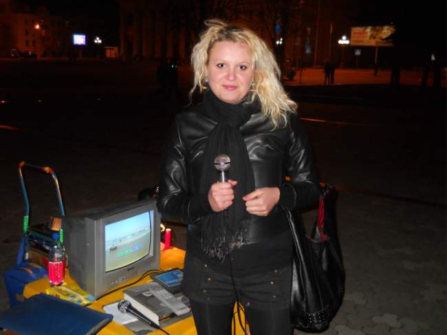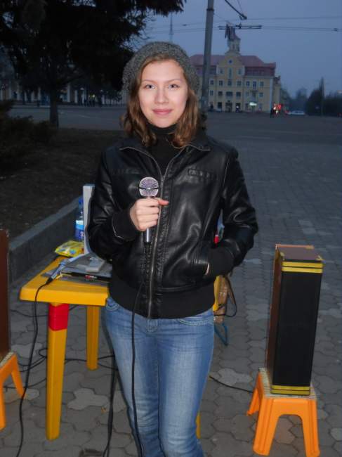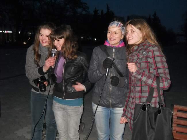 Ольга Воробей, домохозяйка: сегодня сидели с подругой около караоке и слушали. Мужчина, который ведет программу, подошел к нам и не навязчиво пригласил попробывать спеть. Подруга постеснялась, а я согласилась, при условии, что ведущий будет помогать. Года три назад с родителями пели караоке у к-ра Щорса. Думаю, теперь будем приходить сюда почаще – попеть, да и просто посидеть, послушать.