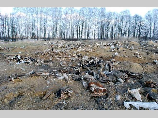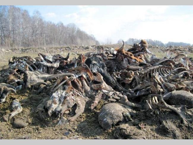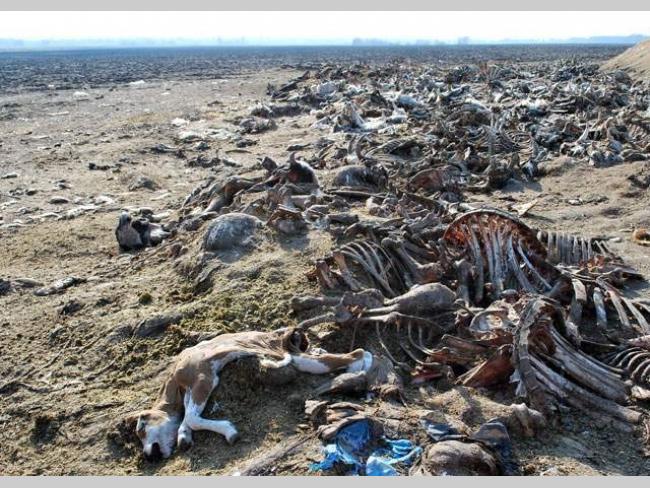 Рештки сотень тварин лежать у полі під відкритим небом. Помітно, що частина трупів зберігається там давно, а є і свіжі.