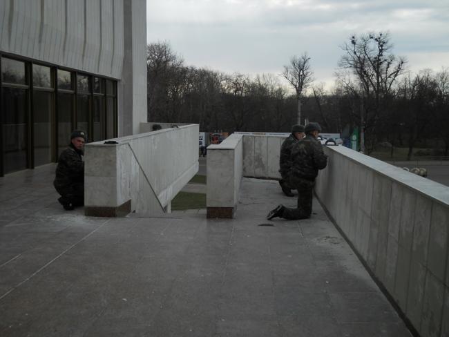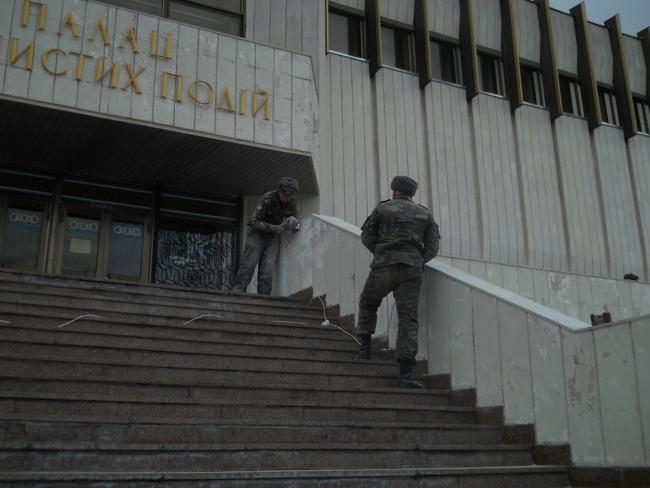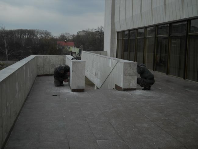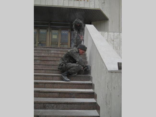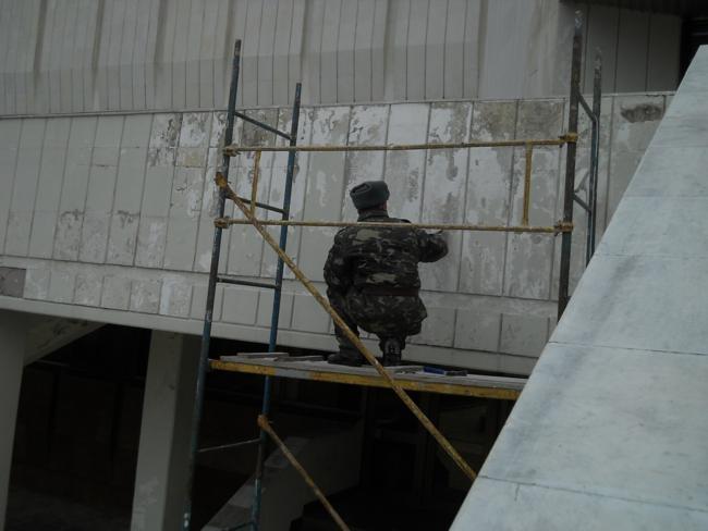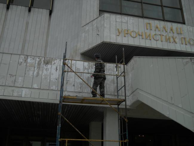 На другой день, опять проезжая мимо, обратил внимание, что главными действующими лицами по приведению дворца в порядок, являются солдаты. Работа идет полным ходом. Достал фотоаппарат и подошел поближе. Парни в солдатской форме заработали еще старательнее и сосредоточеннее.