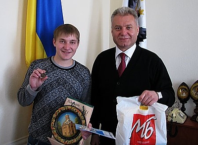Колишній міський голова Чернівців Микола Федорук вручив Денису сувенірний таріль