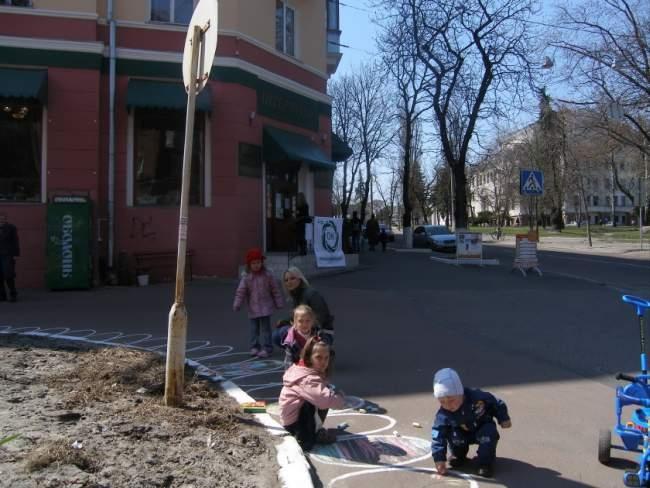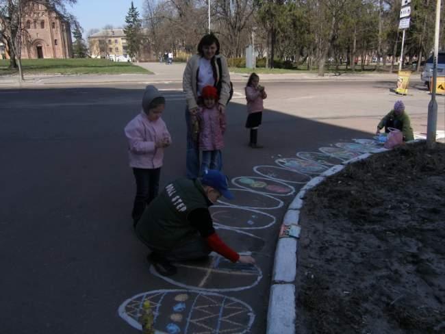 Далі гості події могли за бажанням продовжити розпис або на традиційному матеріалі, або на повітряних кульках, або ж зробити малюнок на асфальті. Останній варіант користався особливою популярністю серед наймолодших