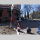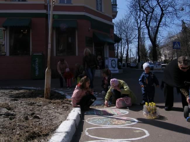учасників, котрими був розмальований асфальт біля клумби квітів поруч із місцем проведення акції.