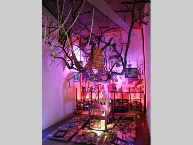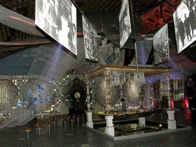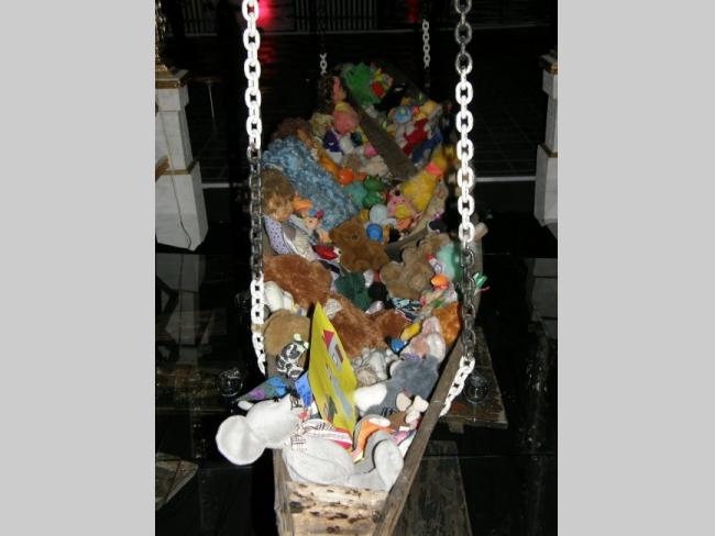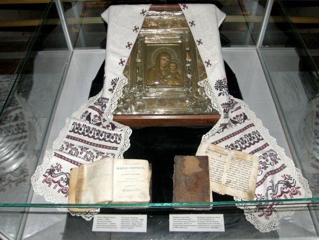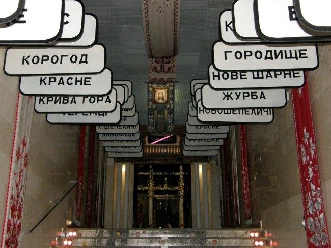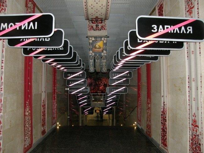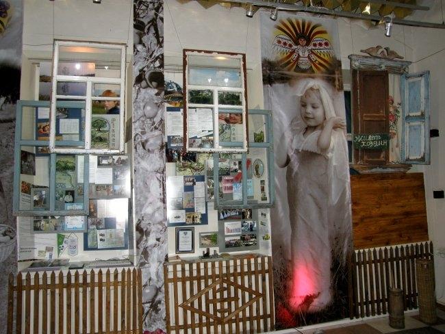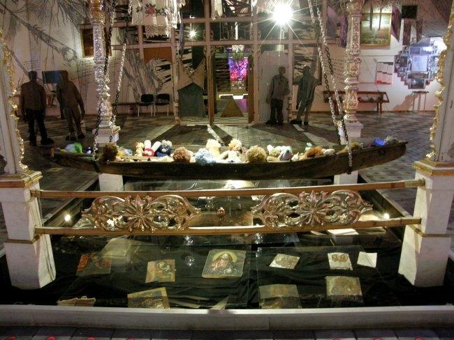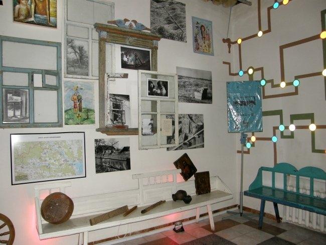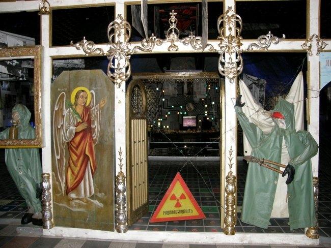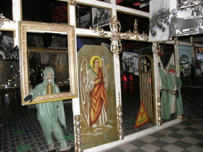 Например, когда вы поднимаетесь по лестнице из вестибюля в сам музей, вас встречают белые дорожные таблички с названиями сел и городков, попавших в зону отчуждения. Когда же спускаетесь обратно – таблички уже черные, с перечеркнутыми названиями этих уже несуществующих населенных пунктов. А чего стоят только детская кроватка, игрушки, рисунки, вышивки, рушники, иконы из зоны заражения, еще хранящие человеческое тепло и заставляющие задуматься над судьбами их бывших владельцев; ныне зияющие пустотой, но бывшие когда–то «живыми» резные наличники окон; деревянный иконостас, где вместо икон – фигуры в защитных костюмах и противогазах.