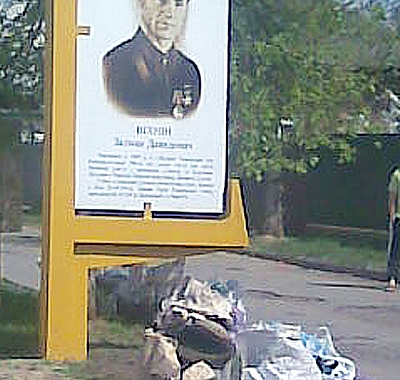 О подготовке к праздникам: вот так наши власти готовились к 9 мая. Видимо, другого места для мусоровоза не нашли. Портрет героя войны Вихнина З. Д. возле Холма Славы