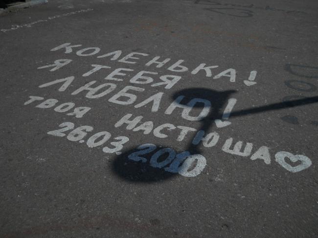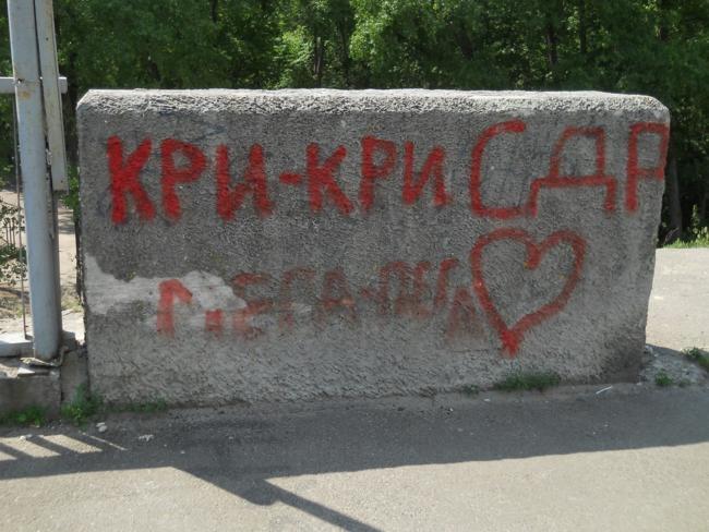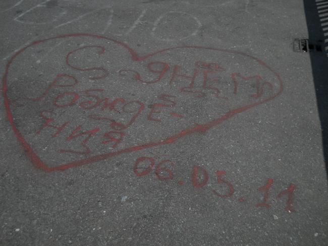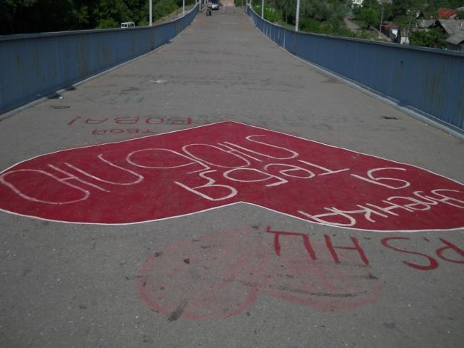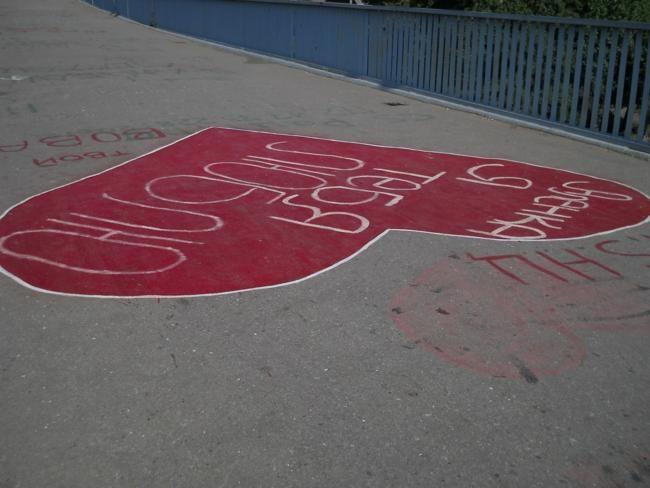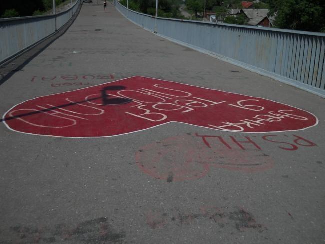 Проезжая утром, 23-го мая, через пешеходный мост, обратил внимание на большое красное сердце. Это сердце, какой-то любитель «наскального рисунка», нарисовал, не пожалев краски, во всю ширину моста. Еще позавчера этого шедевра на мосту не было. По-видимому, теплые вечера и ночи последних дней, оказались не простым временем суток, а временем дружбы и большой, на ширину моста, любви.
