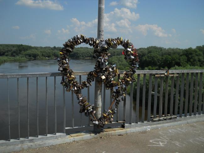 Большое красное сердце – это уже второе, заслуживающее внимание, аналогичное «произведение искусства» на мосту. К первому - металлическому сердцу с многочисленными замочками мы уже привыкли.