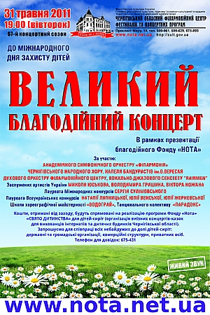 Спешите вместе с фондом «Нота» подарить детям-сиротам незабываемый праздник! Для этого надо всего лишь внести свой маленький, посильный каждому, вклад — купить билет на Большой благотворительный концерт, который состоится 31 мая в зале филармонического центра. В благотворительном концерте примут участие лучшие коллективы филармонического центра: академический симфонический оркестр «Филармония», Черниговский народный хор, секстет Академического камерного хора им. Д. Бортнянского, заслуженные артисты Украины Николай Юськов, Владимир Гришин, Виктор Кожан, лауреат Всеукраинских и Международных конкурсов Сергей Сулимовский, лауреат Всеукринских конкурсов Наталья Липницкая,школа хореографического мастерства «Водограй», артисты Юлия Венская, Наталья Липницкая, Юлия Жерневская, театр танца «Экватор», степ-квартет «Степ-ап», танцевальный коллектив «Парадокс».