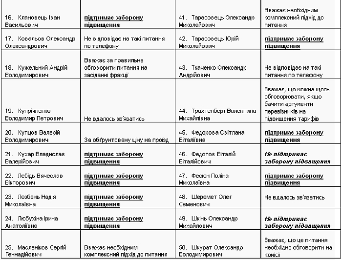 «Чи підтримаєте ви, як депутат міської ради, заборону на рішення виконавчого комітету про підвищення вартості проїзду у транспорті, зокрема мікроавтобусах міста, якщо питання буде внесено в порядок денний наступної сесії міської ради?»