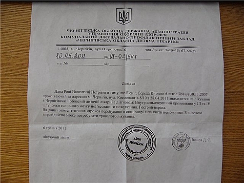 28.04.2011 поступил в Черниговскую детскую областную больницу (ЧДОБ) с диагнозом внутреннечерепное кровоизлияние ІІІ и ІV желудочков головного мозга неопределенного происхождения. Гемарогичный инсульт.