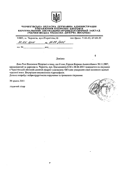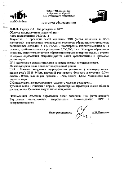 Диагноз по состоянию на 30.05.20011: «Об’ємне утворення лівої половини задньої черепної ямки. Внутрішня окклюзіонна гідроцефалія.. Дитина потребує нейрохірургічного втручання та тривалого лікування»