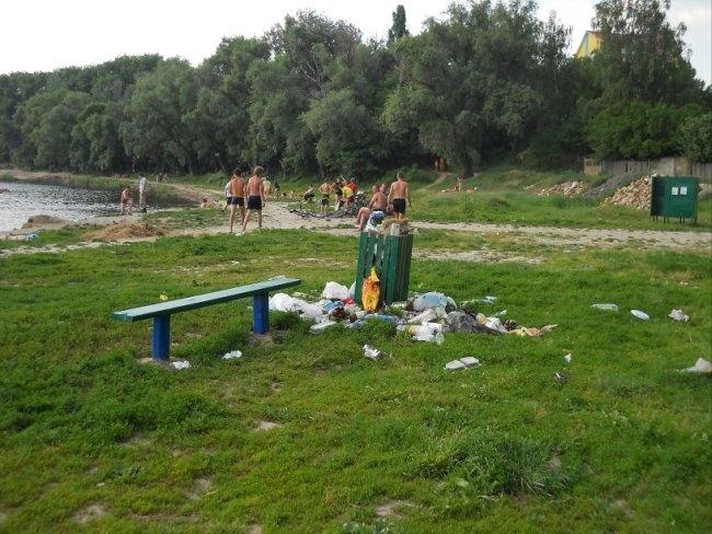 А вот, с чистотой проблема. К людям, предпочитающим именно это место отдыха, претензий предъявить нельзя. Мусор они добросовестно относят к нескольким мусорным бачкам, и кладут рядом, на травку.