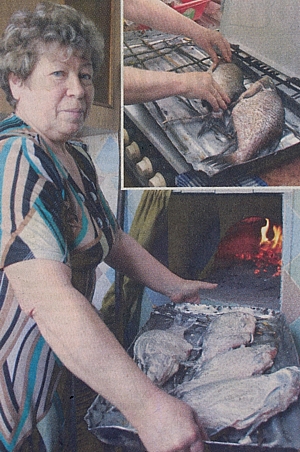 — Затоплюється піч, бажано фруктовими дровами, — показує Ольга Іванівна. — Поки вона витопиться, а це дві-три години, солимо рибу. її натираємо сіллю зовні і зсередини. На спинці великого, товщого за п'ять сантиметрів, ляща робимо надрізи з обох боків, щоб краще пропікалося.