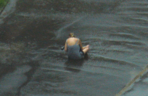Во время дождя девушка села на асфальт помыть шлепанцы