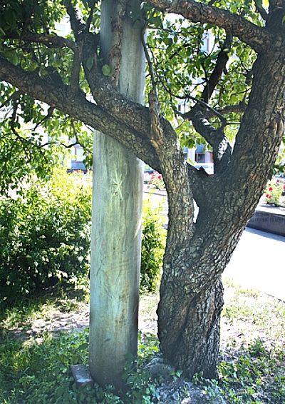 Неразлучные друзья: возле облрады дерево «обвило» столб.