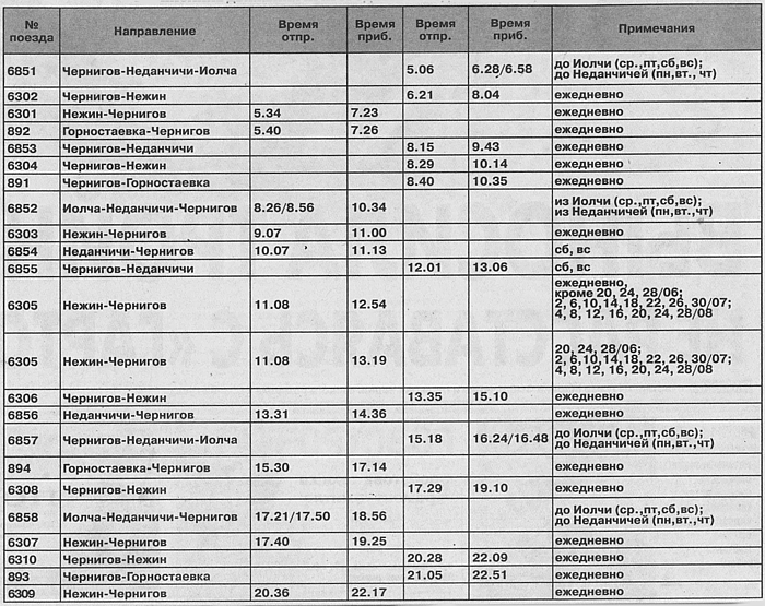 - Действительно, с 20 июня были отменены дизель-поезда, которые курсировали сообщением «Чернигов—Голубичи—Горностаевка», - объяснила Тамара Михайловна. - Вместо этого были назначены дизель-поезда повышенного комфорта сообщением «Чернигов—Горностаевка». Время отправления первого поезда из Чернигова - 8 часов 40 минут, как было и раньше. Он прибывает в Горностаевку в 10 часов 35 минут и отправляется на Чернигов в 15.30, приходит на вокзал в 17.14. Есть поезда и в вечернее время: в 21.05 - отправление из Чернигова, в Горностаевке он в 22.51, а назад, в Чернигов, поезд едет уже на следующий день - в 5.40, приходит в 7.26. Правда и то, что пассажиры, которые в поездах пригородного сообщения раньше пользовались льготами, отныне должны покупать билеты по обычному пассажирскому тарифу. Мы хорошо понимаем, что тех, кто раньше ездил бесплатно, платный проезд не устраивает, но ничего не можем изменить. Черниговский железнодорожный вокзал подчиняется Киевской дирекции. И вопрос об изменении поездов решался на уровне начальника железной дороги. Почему так сделали, я сказать не могу. Была информация, что якобы администрации нескольких райцентров, чтобы удовлетворить потребности жителей своих районов, просили, чтобы станция пустила комфортабельную электричку или дизель-поезд для меньшей загрузки пассажиров. Конечно, время от времени нам поступают жалобы, но мы передаем их в Киев. Поэтому, если что-то и будет меняться в расписании поездов в дальнейшем, то только по распоряжению из Киева.