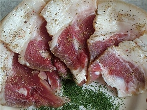 — Засмажую підчеревок. Треба, щоб він був із прослойками, з м'ясом. Шпигую часником, перчиком. Скручую у рулетик, зв'язую грубою ниткою. Вставляю у піч. Можна у фольгу загорнути, а можна й без фольги. Температура треба щоб була і не низька, й не висока. Щоб і жир не витік, і шкірочка рум'яна з'явилася. Визначаю температуру інтуїтивно.