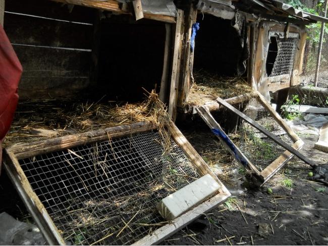 Полуметровой высоты металлическая сетка ограждения погнута, взломаны шесть клеток, а металлические сетки их дверей прогрызены. Деревянный дверной засов, прибитый к косяку, вырван вместе с десятисантиметровым гвоздем.
